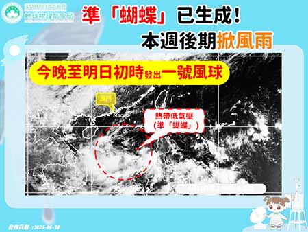 澳門氣象局表示,位於南海中部的低壓區已發展為熱帶氣旋,隨著其進一步增強,預料將成為今年西北太平洋首個獲命名的熱帶氣旋「蝴蝶」。熱帶氣旋的生成位置接近本澳八百公里範圍,並以較緩慢速度移動,昨日(十日)晚間至今日(十一日)初時氣象局將會發出一號風球。於昨日晚上八時,熱帶低氣壓正集結在澳門以南約七百八十公里處,以時速約八公里向西北偏西方向移動,大致趨向廣東西岸至海南島一帶。