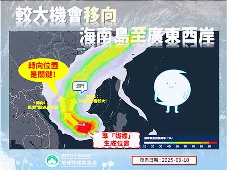 根據最新預測資料顯示,未來兩日熱帶氣旋會緩慢向西北方向曰移近海南島附近,隨後於本週後期出現轉向,靠近廣東西部沿岸。在轉向的過程中,關注兩個主要因素:(一)熱帶氣旋會否先登陸海南島後才轉向;(強度將有所減弱);(二)熱帶氣旋轉向後,會否採取較東北路徑,靠近珠江口以西三百公里範圍。(對本澳影響較明顯)。氣象局呼籲,公眾密切關注氣象局的最新天氣資訊,以適時瞭解潛在熱帶氣旋的發展態勢,並適時提前做好預防準備。