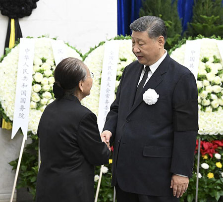 上午9時30分許,習近平、李強、趙樂際、王滬寧、蔡奇、丁薛祥、李希等,在哀樂聲中緩步來到熱地同志的遺體前肅立默哀,向熱地同志的遺體三鞠躬,並與熱地同志親屬一一握手,表示慰問。