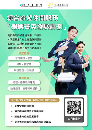 【特訊】為支持本地人才全面發展,拓展多元職涯路向,勞工事務局(下稱勞工局)和銀河娛樂集團(下稱銀娛)合作推出“銀娛菁英發展計劃(酒店營運及客運統籌)"(下稱計劃),以“先入職、後培訓"方式,為有志投身酒店營運及客運統籌的澳門居民,提供全方位的培訓及事業發展機會,計劃由6月16日起接受申請。