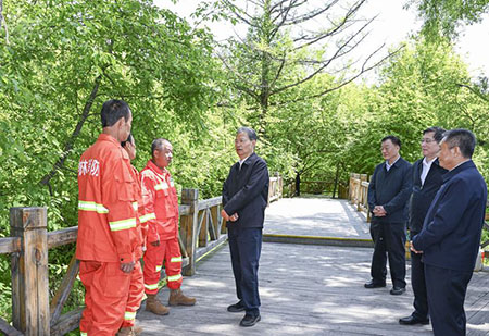 趙樂際率全國人大常委會執法檢查組檢查森林法實施情況,深入森工公司應急事務中心、林場和林業職工家中,實地檢查和瞭解法律實施情況;主持召開座談會,聽取政府部門、林業專家、一線工作者關於加強森林法實施的意見建議。