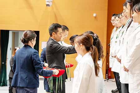 本院首屆住院醫生培訓計劃共招收了28位本澳年青的住院醫生,於今日(7月1日)正式開始為期6年的培訓。儀式開始前學員們首先觀看了北京協和醫院“三位大醫生”記錄短片,感受“大愛成就大醫”的醫學初心。在儀式上,李偉成副院長向在場嘉賓介紹了是次培訓計劃的詳情,同時感謝衛生局的支持,協和澳門醫學中心與衛生局簽訂了《關於委托進行醫學專科培訓的合作協議》,共同攜手提升本地專科醫生專業水平。隨後,由羅奕龍局長、吳文銘院長、李展潤主席、李偉成副院長、戴華浩主任及曾潭飛主任向各位住院醫生頒授工牌,代表著學員們正式開啟他們在協和澳門醫學中心的培訓生涯。