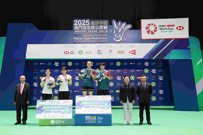 【特訊】金沙中國與澳門羽毛球總會連續第二年攜手合辦的「金沙中國澳門羽毛球公開賽」周日圓滿落幕,大會為一眾於賽事中勝出的運動員頒贈獎牌。為期六日的賽事於7月29日至8月3日期間在澳門東亞運動會體育館舉行,獲澳門體育局全力支持。此外,賽事決賽及準決賽亦於國際羽毛球聯會的YouTube頻道同步直播,讓世界各地的球迷都能見證羽毛球選手連環激戰的精彩時刻。