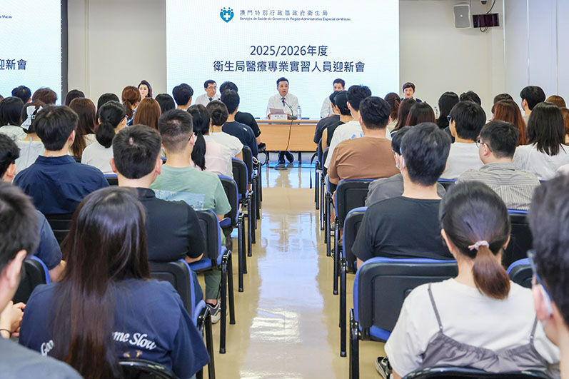 【特訊】衛生局持續完善本澳醫療人才隊伍建設,通過系統性實習培訓提升醫療人員的臨床實踐技能與專業素養。新一屆(第2025/2026年度)14個醫療人員類別共446名實習人員於9月1日起在衛生局實習。日前衛生局為該批醫療專業實習人員舉辦迎新會,由衛生局局長羅奕龍主持,副局長鄭成業、仁伯爵綜合醫院代院長戴華浩、社區醫療衛生廳代廳長王燕和仁伯爵綜合醫院代護士總監袁婉文出席了迎新會,聽取實習人員的期望及意見並進行了互動交流。