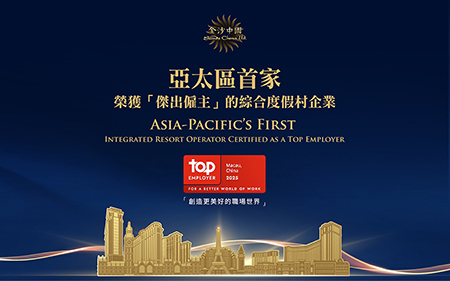 【特訊】金沙中國有限公司憑藉在引才、育才和留才方面的卓越表現,榮獲國際權威的「傑出僱主調研機構」(Top Employer Institute)頒發「傑出僱主」認證,是澳門旅遊服務業界首家獲得此項國際認可的企業,同時成為亞太區首家通過評審的綜合度假村營運商。