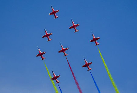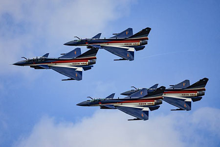 9時前後,隨著兩架運-12D先後起飛,“八一”“藍鷹”跳傘隊攜帶黨旗、國旗、八一軍旗和空軍軍旗先後躍出機艙,在高空依次打開橫幅、標語。 10時許,簡短的開幕式後,空軍航空大學“紅鷹”飛行表演隊、空軍八一飛行表演隊以及殲-16、殲-20、運油-20A、空警-500等多型戰機帶來精彩飛行表演。