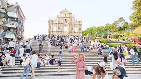 昨日下午在中區一帶人流暢旺,大三巴街一帶人頭湧湧,有小食店的店主表示,多天假期生意理想,較平日增六至七成,有手信店負責人指出,連日假期生意暢旺,顧客平均消費一千多元。