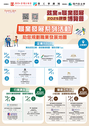 【特訊】為持續協助澳門居民拓展職業發展、助力緊握發展機遇,促進人才與企業對接;澳門工會聯合總會與勞工事務局將於11月10日至11日一連兩日假澳門旅遊塔會展娛樂中心四樓聯合舉辦大型招聘會,2025秋季“就業與職業發展博覽會”以“多元就業渠道、行業職涯交流、現場面試招聘及職涯輔助服務”四大方向為主軸,特設“職業發展系列活動”,其中聯合部分招聘企業推出企業參觀+求職技巧的活動(企業Tour),讓參與者親身體驗企業環境與文化,從中更能透過過程獲得實用求職技巧,助力增強居民就業能力與職業發展。