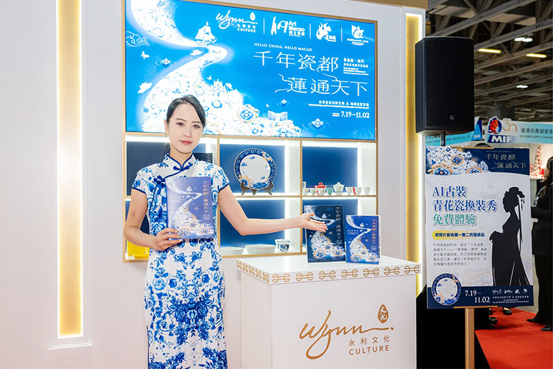 展區亦展示了永利景德鎮大型陶瓷主題光影藝術展元素——「千年瓷都,蓮通天下——『景德鎮.澳門』海絲瓷光數字藝術展」,突顯今屆展區融合科技創新、藝術文化與中小企力量的特色。展 區中特設精品展示區,展出展覽主題禮品店的陶瓷藝術商品,讓觀眾可近距離欣賞,體驗藝術與文化的完美商業結合。同時,現場設有 AI 互動體驗環節,結合陶瓷藝術進行二次創作,觀眾可透過 AI 生成專屬古風造型電子明信片,感受「景德鎮