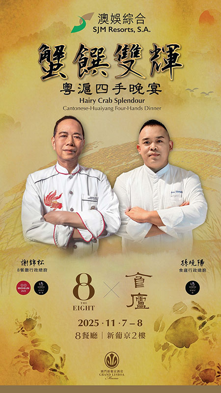 「蟹饌雙輝:粵滬四手晚宴」詳情:日期及時段: 11 月 7 日及 8 日下午 6 時至晚上 10 時地點:澳門新葡京酒店二樓「8 餐廳」席位及套票數量有限,敬請預約。如欲預訂或查詢,歡迎致電(853) 8803 7788