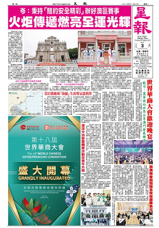 【特訊】世界華商大會今天(三日)在本澳開幕。大會昨晚舉辦歡迎晚宴,澳門經濟財政司司長戴建業表示,本澳正邁向由復甦發展到高質量發展的新階段,全力推進「1+4」經濟適度多元發展的策略,希望參與大會的華商親身感受澳門最新的經濟社會發展面貌,並向世界各地分享澳門以至大灣區的發展機遇。