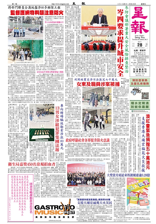 【特訊】特區政府高度關注鄰近地區近日發生的一宗嚴重火災,亦一向重視工地和工程的消防安全。消防局聯同土地工務局、勞工事務局及市政署,於昨日組成兩支隊伍開始對本澳各區施工中的地盤及棚架進行聯合巡查,經檢查消防設施配備、危險品存放管理及緊急疏散通道等情況,均符合有關的安全要求,承建商亦已按規定出示棚架安全保護網的阻燃合格證明文件。據最新統計的數字,目前全澳約有五百六十六個建築工地,其中六十多個涉及棚架工程,政府將於短期內對所有棚架工程進行密集式巡查,並要求承建商嚴格履行防火責任,加強預防措施,以及提醒工友注意防火,共同確保消防安全。