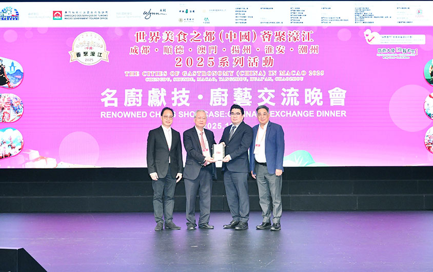 同日晚上,「世界美食之都(中國)薈聚濠江2025系列活動——名廚獻技˙廚藝交流晚會」於永利澳門宴會廳舉行。六都名廚聯袂呈獻極具地方風味的特色佳餚,為賓客帶來一場融匯視覺與味覺的饗宴。永利澳門及永利皇宮澳門土生菜廚藝大師顧問黃文龍先生代表永利接受感謝狀,體現企業對推動餐飲文化交流的持續投入。