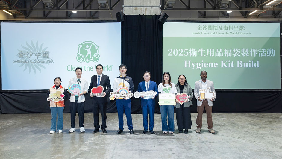 【特訊】金沙中國有限公司周四組織330名團隊成員以及來自聖若瑟大學、澳門可持續發展協會、澳門樂施會及澳門義務青年會的義工,於澳門威尼斯人金光會展為社會企業潔世(Clean the World)製作30,000 個衛生用品福袋,連續12年與本地社服機構攜手支持潔世推動社區衛生工作。