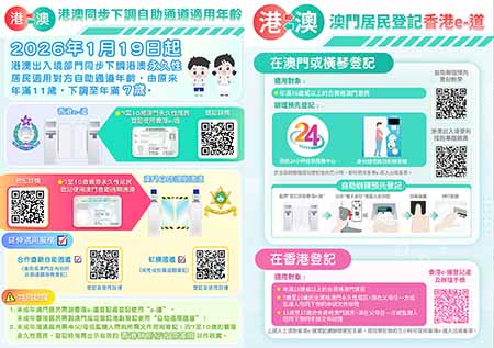 港澳非永久性居民可使用自助通關服務方面,自今年一月十九日起,年滿十八歲,持用澳門居民往來香港特別行政區旅遊證的澳門非永久性居民,除可前往香港入境事務處的e-道登記處登記使用香港e-道服務外,也可在澳門八個政府二十四小時自助服務中心,以及橫琴政務服務中心二十四小時自助服務區和「澳門新街坊」澳門政務二十四小時自助服務中心使用澳門政府的自助辦證機進行登記;年滿十八歲,並持有有效的香港居民身份證及有效期多於九十天的香港特別行政區簽證身份書的香港非永久性居民,除可於澳門的自助通關登記處登記使用澳門自助過關服務,也可使用設於香港指定管制站或各人事登記辦事處的自助登記服務機預先登記。年滿十一歲至十七歲的港/澳非永久性居民,須在父/母或監護人陪同下,帶同申請文件親臨對方口岸的自助通關登記處辦理登記手續。