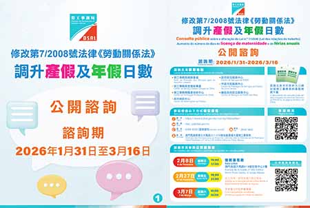 【特訊】勞工事務局昨日(30)日舉行新聞發佈會,宣佈由今日(31)日起至3月16日期間,就修改第7/2008號法律《勞動關係法》規定的產假及年假日數,展開為期45日的公開諮詢。諮詢文本建議產假調升至90日,年假則建議按年資遞增,每滿2年年假日數增加1個工作日,最多增至12個工作日,務求逐步提升僱員的勞動權益保障及與國際標準接軌。期望公眾踴躍發表意見,共同促進澳門經濟和社會的健康發展。
