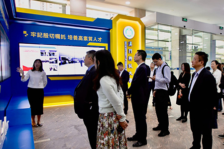 考察團先到訪澳門科技大學,詳細了解由澳門科技大學副校長、藥學院院長朱依諄創立的依諾醫藥控股集團在原創新藥領域的突破進展,並現場體驗了由澳門科技大學創新工程學院工程科學系教授韓子天團隊研發、中醫藥廣東省實驗室及澳門科學技術發展基金資助支持的「澳本堂」AI中醫藥機器人,對其融合中醫智慧與人工智能技術、實現快速診斷與智能配藥的一站式服務模式表示高度認可。