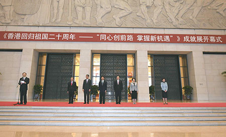下午3時,習近平等領導人來到國家博物館,在全國政協副主席、香港特別行政區行政長官梁振英等陪同下走進展廳參觀展覽。展覽由香港特別行政區政府主辦,以“同心創前路,掌握新機遇”為主題,共分“一國兩制”、“香港近況一覽”、“一起緊握機遇”、“一起拓展商貿”、“一起推陳出新”、“一起攜手經歷”、“一起緊扣相連”、“一起凝聚力量”、“一起保育承傳”以及“結語”等10個展區,通過大量圖表、模型以及多媒體互動內容,全面展現香港回歸祖國20年特別是近5年來各項事業取得的巨大成就。