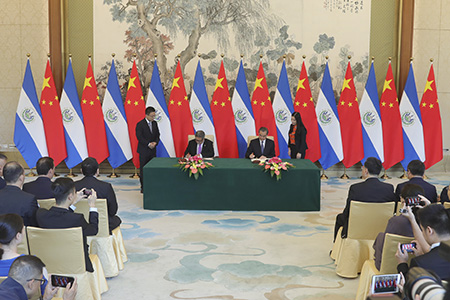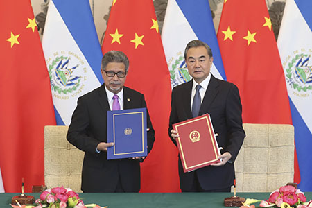 【中新社北京8月21日電】(記者 蔣濤)21日上午,中國國務委員兼外交部長王毅在北京同薩爾瓦多外長卡斯塔內達簽署兩國關於建立外交關係的聯合公報。