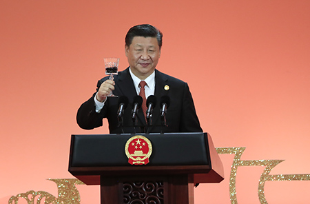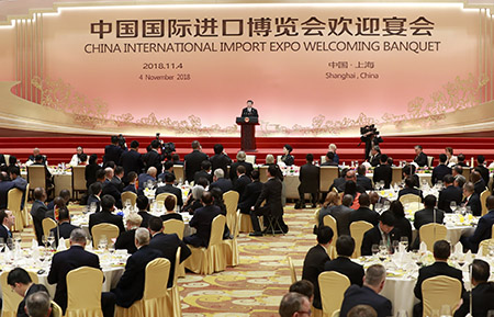 【中新社上海11月4日電】(記者 梁曉輝)中國國家主席習近平和夫人彭麗媛4日晚在上海舉行宴會,歡迎出席首屆中國國際進口博覽會的各國貴賓。