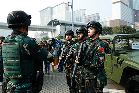 司法警察局危機談判組與恐怖分子展開談判期間,成功游說釋放1名受槍傷的人質,並得悉其持有化學武器,保安當局經綜合評估,考慮可能會出現大量傷者或受化學污染的群眾,為了在短時內解決危機,行政長官根據《澳門特別行政區基本法》、《中華人民共和國澳門特別行政區駐軍法》及第6/2005號法律《中國人民解放軍駐澳門部隊協助維持社會治安和救助災害》,向中央政府提出請求駐澳部隊到場協助洗消及相關救援工作。