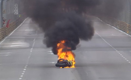 格蘭披治電單車自由練習安排在昨日早上七時半進行,練習開始不久便出現今屆首面紅旗,自由練習開始六分鐘左右,五十五號車德臣在水塘彎撞欄,大會出示首面紅旗,車手德臣被送院救治,因腰椎骨折,要進行手術。練習暫停五分鐘後繼續進行,四十九號西班牙車手多利斯在文華東方彎位片彎時失控撞欄,多利斯撞欄後倒地受傷,而所駕戰車在賽道上繼續滑行,在滑行不久便告著火焚燒,整部鐵馬被火焚燬,大會再次出示紅旗,多利斯被送院救治,其後多利斯所屬車隊的工作人員表示,多利斯目前傷勢無大礙,但需留院觀察,相信不能繼續比賽。