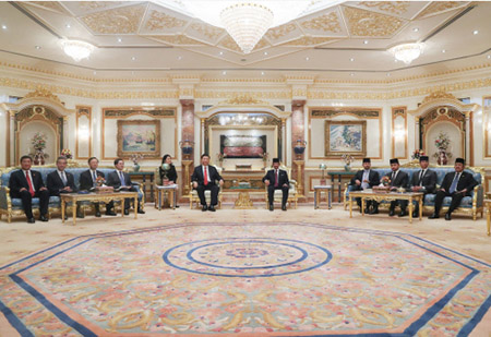 習近平同文萊王室成員親切交談。習近平表示,衷心祝賀文萊經濟社會發展取得的成就。一踏上這片和平美麗的土地,我就真切感受到蘇丹陛下和王室以及文萊人民對中國人民的深情厚誼。中方讚賞文萊王室長期奉行對華友好政策,歡迎王室成員多到中國各地走走、看看。相信在雙方共同努力下,中文傳統友好將不斷發揚光大,兩國互利合作將不斷取得豐碩成果。