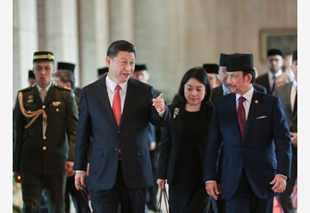 習近平抵達王宮時,哈桑納爾在停車處熱情迎接。兩國元首登上檢閱台。儀仗隊行禮,軍樂隊奏中文兩國國歌。現場鳴放21響禮炮。在哈桑納爾陪同下,習近平檢閱儀仗隊。檢閱畢,兩國元首前往王宮內廷。習近平同文萊王室成員、主要官員及各國駐文萊使節握手。哈桑納爾同中方陪同人員握手。