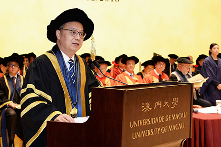 【特訊】澳門大學前(1)日舉行「2018年榮譽學位及高等學位頒授典禮",八百多名博士、碩士和學士後文憑/證書課程的學生獲頒畢業證書。典禮上,澳門特別行政區行政長官兼澳大校監崔世安代表、社會文化司司長譚俊榮表示,澳門特區政府將繼續支持澳大的發展,他還鼓勵畢業生積極參與大灣區發展,在時代洪流中乘風破浪,書寫自己的精彩故事和燦爛人生。