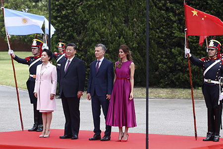 習近平和夫人彭麗媛在馬隊護衛下前往總統官邸,禮兵在林蔭大道兩側列隊接受檢閱。抵達榮譽廣場時,軍樂團奏響歡快的進行曲。馬克里和夫人阿瓦達上前熱情迎接。兩國元首夫婦登上檢閱台。軍樂團奏中國、阿根廷兩國國歌。