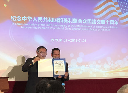 安東尼•蘭登為紀念中美建交40周年致賀狀。賀狀上寫道,過去40年,美中關係影響了全世界。我們必須共同努力,維護世界的持久和平與穩定,捍衛人民的尊嚴和權利。未來40年,作為環太平洋地區重要組成部分,加州將繼續致力于推動這一重要雙邊關係的發展。