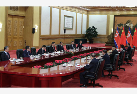 關於朝鮮半島形勢,習近平積極評價朝方為維護半島和平穩定、推動實現半島無核化所採取的積極舉措,表示去年在中朝及有關方共同努力下,半島問題政治解決進程取得重大進展。當前,半島和平對話的大勢已經形成,談下去並談出成果成為國際社會普遍期待和共識,政治解決半島問題面臨難得的歷史機遇。中方支持朝方繼續堅持半島無核化方向,支持北南持續改善關係,支持朝美舉行首腦會晤並取得成果,支持有關方通過對話解決各自合理關切。希望朝美相向而行,中方願同朝方及有關方一道努力,為維護半島和平穩定,實現半島無核化和地區長治久安發揮積極建設性作用。
