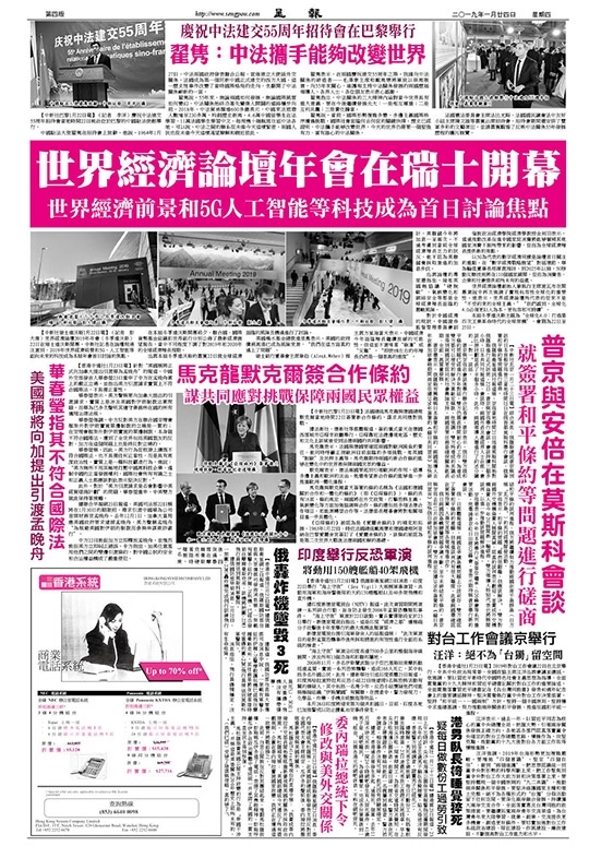 【中新社瑞士達沃斯1月22日電】(記者 彭大偉)世界經濟論壇2019年年會(冬季達沃斯)22日在瑞士達沃斯開幕。中新社記者在論壇現場注意到,2019年世界經濟前景和5G、人工智能等面向未來的科技成為本屆年會首日討論的焦點。