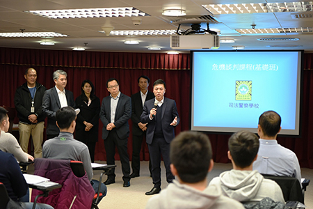 危機談判課程由司警局危機談判組資深談判人員任教,主要內容包括危機談判導論、談判組的架構分工及案例研討,亦重點講解風暴潮撤離計劃啟動期間的危機處理技巧;又設有模擬個案演練,讓受訓人員將課堂上所學知識運用到實務工作中。