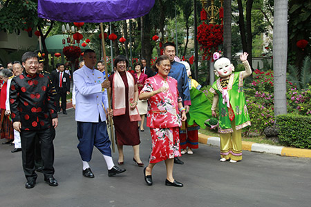 當天下午,在載歌載舞的“年畫娃娃”簇擁下,呂健夫婦和詩琳通公主來到使館主樓前,共同為雄獅點睛。慶祝新春的舞獅表演隨即開始,鑼鼓鞭炮也響了起來。之後,呂健和公主等與會嘉賓一起欣賞了中國甘肅歌舞團藝術家和泰國學生聯袂奉上的精彩演出。