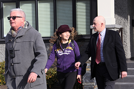 孟晚舟上午離開住所赴法院時,大批媒體記者分別在其住所及法院門外及法院地下車庫蹲守。