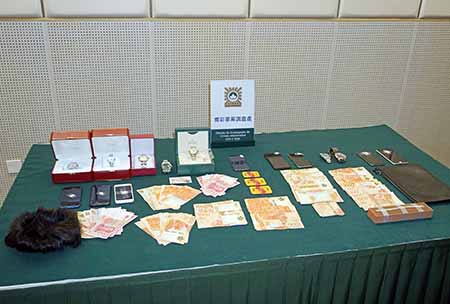 司警局接報經調查後鎖定五名疑犯身份及所居住地點,在前(十四)日下午分別去到黑沙環區的住宅及新口岸娛樂場疑犯上班的地點,把五人拘捕,在五人身上、住所及汽車上搜獲港幣二十九萬六千七百元現金,二萬一千元港幣籌碼,七隻名貴手錶(價值由七萬至十五萬元),一條鑽石手鍊,相信全是詐騙所得。