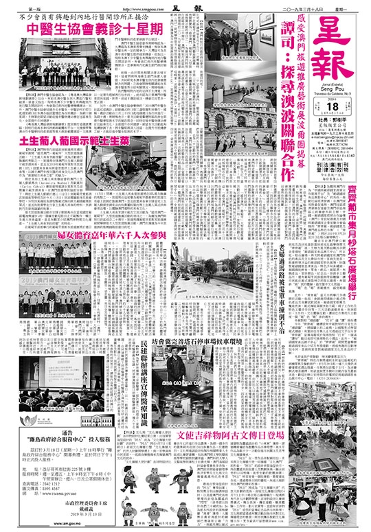 另外,由澳門中醫生協會舉辦的「2019澳門中醫生社區巡迴義診」啟動儀式昨日假三盞燈圓形地舉行。據稱,義診活動由三月二十四日起每個週日為巿民進行,為期十週。周稀鳴表示,是次活動是響應特區政府全面提升醫療服務水平的施政理念,同時促進中醫保健治療在社區普及化,全面提升巿民健康。期望本次活動能夠延續發展下去,將中醫服務深入社區,在提升巿民健康之餘,亦能促進中醫生服務的水平。