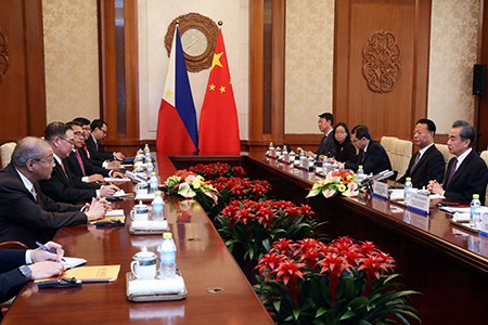 王毅表示,在兩國元首關心和引領下,中菲關係過去三年完成轉圜、鞏固、提昇“三部曲”。去年11月習近平主席對菲律賓進行的國事訪問取得圓滿成功,中菲關係提昇為全面戰略合作關係,進入新的發展階段。雙方政治互信不斷深化,務實合作成果豐碩,積極探索海上合作,攜手維護南海和平穩定,著力推進安全、發展、人文三大支柱領域合作,穩步拓展共建“一帶一路”,不斷推動中菲關係提質昇級。