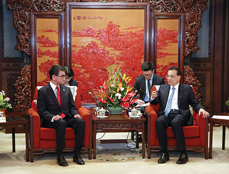 李克強表示,中日互為重要近鄰。去年以來,在雙方共同努力下,兩國關係重回正軌並取得新的發展。雙方應當在中日四個政治文件確立的原則基礎上,本著“以史為鑒、面向未來”的精神,推動兩國關係長期健康穩定發展。