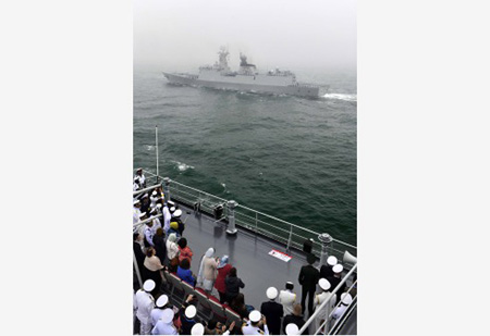 15時許,檢閱艦調整航向,向參加慶典活動的來訪艦艇編隊駛去。