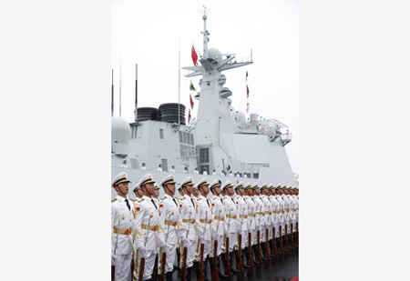 習近平向各國官兵揮手致意。各國海軍代表團團長在檢閱艦後甲板就座觀禮。