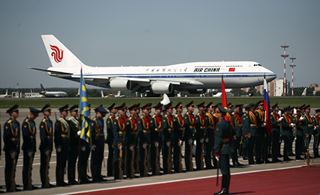 當地時間中午12時,習近平乘坐的專機抵達莫斯科伏努科沃專機機場。習近平步出艙門,俄羅斯政府高級官員在舷梯旁熱情迎接。