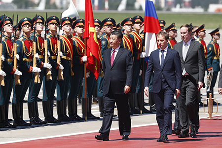 俄方為習近平主席在機場舉行迎接儀式。軍樂團奏中俄兩國國歌。習近平檢閱俄羅斯三軍儀仗隊及分列式。