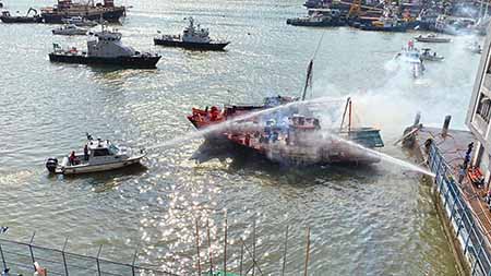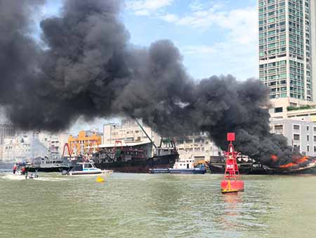 昨日下午三時二十五分左右,海事局及海關船隻在執勤時發現內港五號B碼頭對開海面,一艘編號“珠灣36XX”漁船發生火警,發生火警的漁船火勢非常猛烈,濃煙滾滾衝上幾十公尺高空,遠處也可以清楚看到,漁船的駕駛室、船艙及甲板均火光熊熊,火勢迅速蔓延,並波及停泊在旁邊的另一艘漁船。