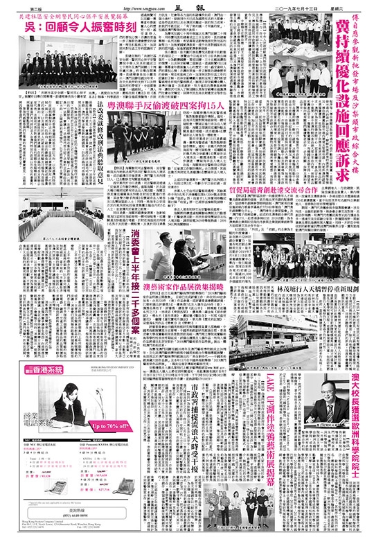 街總主辦的「共建社區安全網、警民同心保平安暨慶祝中華人民共和國成立七十周年及澳門回歸二十周年圖片展」昨日舉行開幕禮。街總理事長吳小麗表示,澳門回歸祖國20年來,在中央政府的支持下以及特區政府的帶領下,全面貫徹落實「一國兩制」、「澳人治澳」、高度自治方針,嚴格依照《憲法》和《基本法》辦事,科學施政,不斷促進經濟騰飛,亦致力民生、社會等各方面的和諧穩步向前。澳門由一個小漁村,發展到今天已成為國際知名的大都會,這是特區政府以及全澳居民團結一致的努力成果。但我們不能忘記,「有了強的國,才有富的家」,祖國是澳門繁榮的強大後盾。