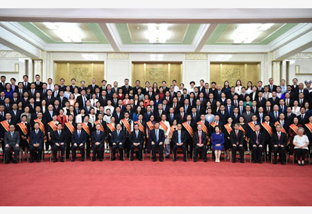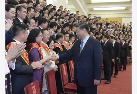 上午10時,習近平等來到人民大會堂北大廳,全場響起熱烈掌聲。習近平等同代表們親切握手,不時交談,並同大家合影留念。