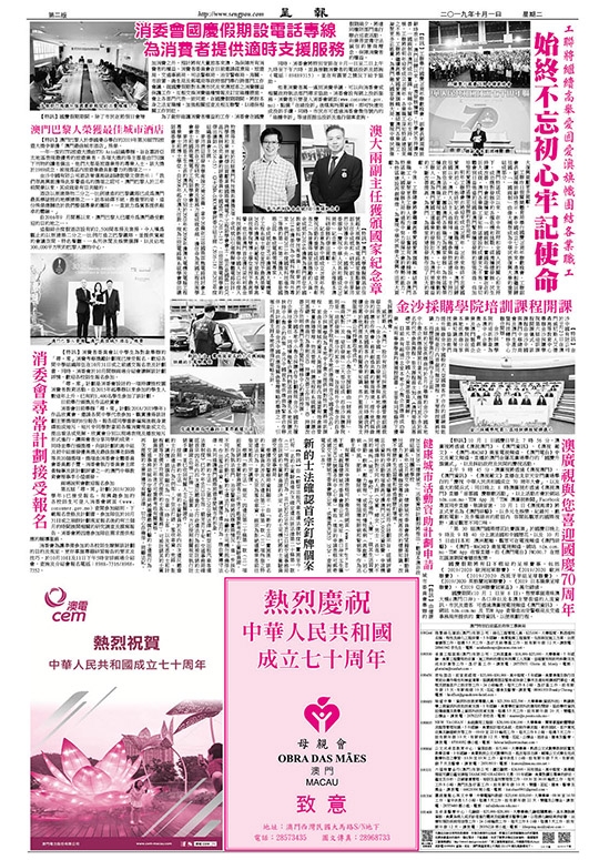 【特訊】國慶假期期間,除了市民在節假日會增加消費之外,預計將有大量旅客來澳,為保障所有消費者的權益,消費者委員會在日前邀請經濟局、旅遊局、交通事務局、司法警察局、治安警察局、海關、市政署、衛生局及郵電局等政府部門舉行跨部門工作會議,就國慶假期對本澳市民及來澳旅客之消費權益保護工作,互相交換消費維權情報及訂定維權措施。會上各部門代表一致同意,在國慶假期期間,將按本身之法定職權,加強相關巡查及相互聯繫,以確保相關工作到位。