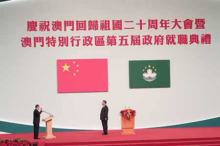 慶祝澳門回歸祖國二十周年大會暨澳門特區第五屆政府就職典禮昨日上午十時在澳門東亞運動會體育館隆重舉行,現場氣氛莊嚴熱烈,出席典禮的嘉賓約有一千一百人。在國家主席習近平監誓下,賀一誠宣誓就職;緊接着,由習近平監誓,第五屆特區政府主要官員和檢察長,在賀一誠帶領下宣誓就職。隨後,在賀一誠監誓下,澳門特區行政會委員宣誓就職。
