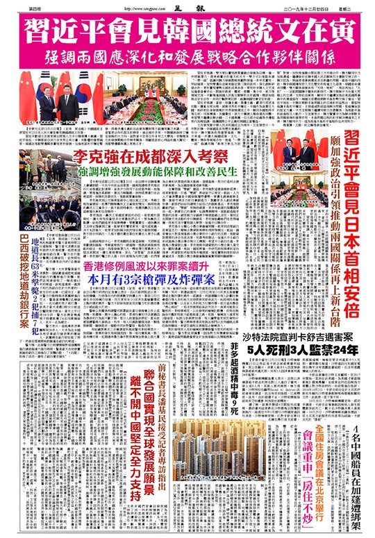 習近平歡迎安倍晉三來華出席第八次中日韓領導人會議。習近平指出,在雙方共同努力下,中日關係持續改善發展。今年6月,我同首相先生在大阪會晤,一致同意推動構建契合新時代要求的中日關係,共同開闢兩國關係新未來。當前,中日關係面臨重要發展機遇,中方願同日方保持密切溝通,加強政治引領,推動中日關係再上新台階,更好造福兩國人民。